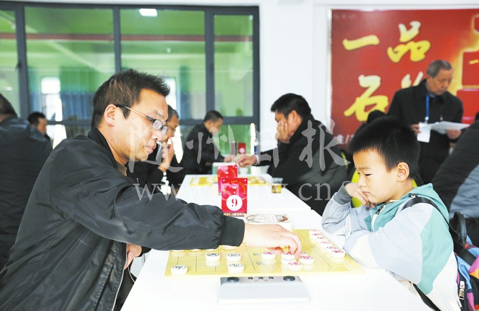 11月9日至10日,2019年随州市象棋公开赛举行。图为一名少儿选手和成年选手在比赛中。(随州日报全媒记者 徐斌摄)