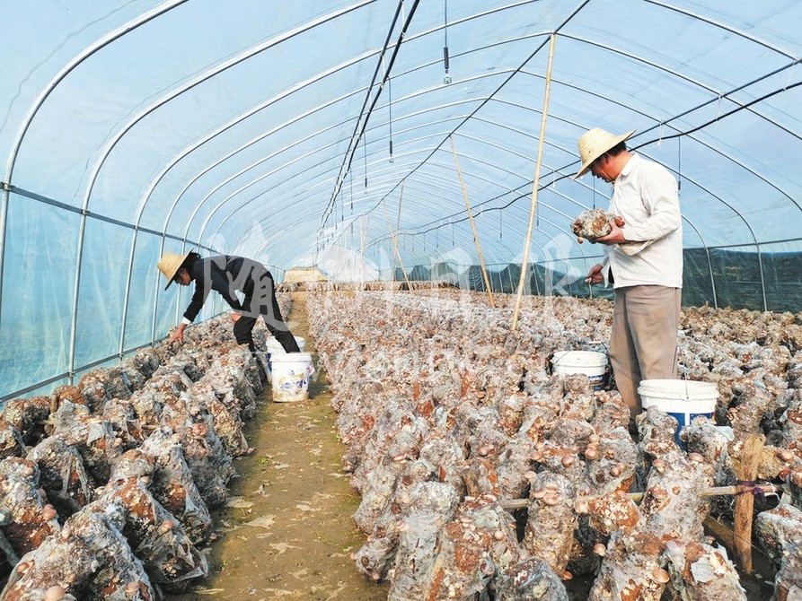 曾都区洛阳镇邱畈村集中有限的扶贫资金走产业扶贫之路,全村发展香菇大棚100个,种植规模达50万棒,年产值300余万元,为贫困户创收80万元。图为工人在邱畈村扶贫共创基地采摘地栽香菇。(随州日报全媒记者 李文军摄)