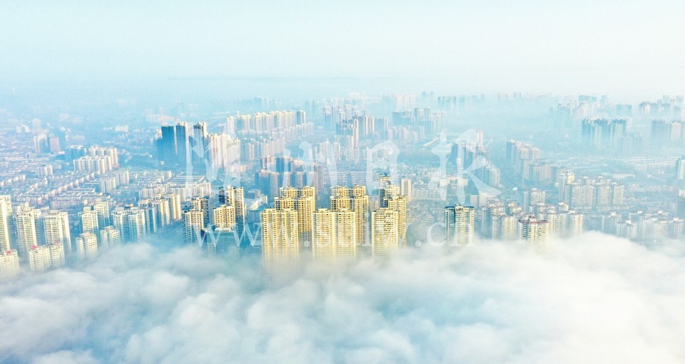 12月11日上午,随州城区出现大雾,无人机在百米上空俯拍的画面宛如仙境。 (随州日报全媒记者徐斌摄)