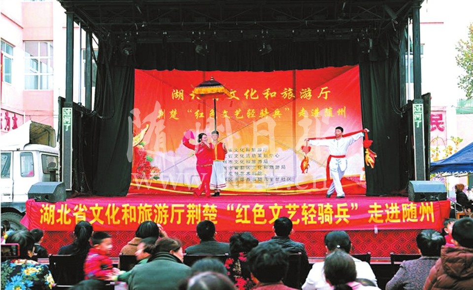 近日,省文化和旅游厅荆楚红色文艺轻骑兵,到曾都区北郊办事处八里岔社区开展送戏下乡文艺演出活动,为当地居民带来一场丰盛的文化盛宴。 (随州日报通讯员 洪 瑞摄)