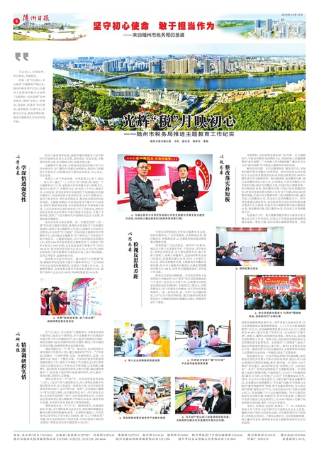 随州日报全媒记者 王松 通讯员 蒋泽亮 黄练 不忘初心,方得始终。牢记使命,方能致远。 自第二批“不忘初心、牢记使命”主题教育开展以来,随州市税务局牢记全心全意为人民服务的根本宗旨和