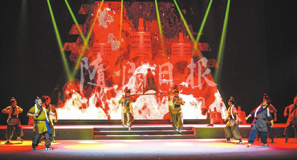 12月13日晚,大型原创历史题材随州花鼓戏《随国金声》在神农大剧院上演。该剧讲述了2000多年前战国时期随国曾侯乙不畏艰难铸造编钟的感人故事。整个剧情大气磅礴,气势恢宏,再现了我国古代青铜工艺及音乐艺术的巨大成就。 (随州日报全媒记者 李文军摄)
