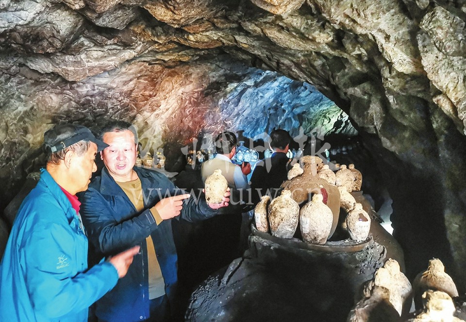 随县殷店镇熊姓酿酒世家酿酒工艺被列为随县非物质文化遗产项目,第四代酿酒传人熊明贵在漂水源头神农洞藏了30多万斤自酿陈年老酒,其洞藏酒是利用当地天然山泉水、祖传土曲古法酿造的,长年藏于恒温恒湿的山洞环境,白酒经过长时间低温发酵,口感绵柔醇厚,网上销售十分火爆。(随州日报全媒记者 李文军摄)