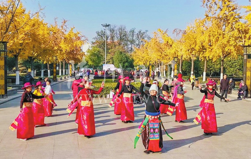清晨,神农公园里,一群身着藏服的“卓玛”跳起了欢快的藏舞。近年来,市委市政府深植生态发展理念,建设生态之城,让城市颜值不断增长,市民生活幸福指数持续提高。 (随州日报全媒记者李文军摄)