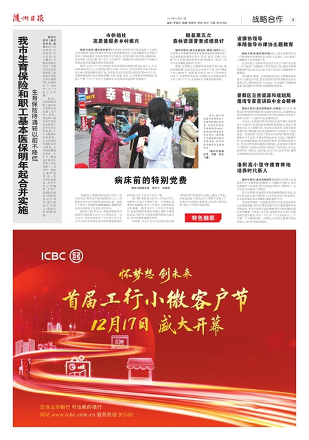 随州日报讯(通讯员朱珍、姚玲)近日,市医保局、市财政局、市人社局、市卫健委、市税务局联合印发了《随州市生育保险和职工基本医疗保险合并实施细则》,该细则将于 2020年1月1日起正式实施。