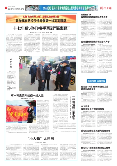 随州日报讯(全媒记者包东流、通讯员刘刚、梅广)2月20日,江西省支援随州市前方指挥部指挥长、江西省委统战部常务副部长陈敏代表江西省委、省政府到广水市看望慰问江西援随医疗工作者。副市长郑晓峰参加慰问。