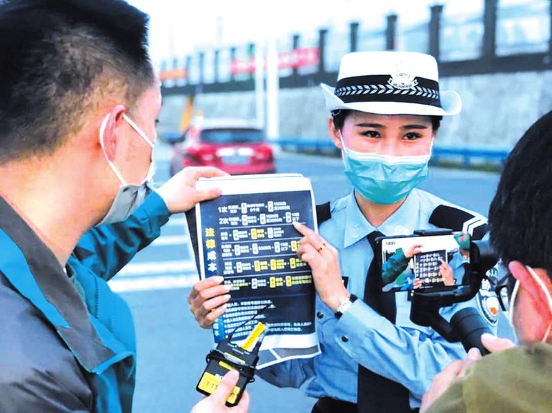 近日,随州交警开展现场执法直播活动,整治行人、非机动车等交通违法行为,同时向网友们介绍了酒精测试仪、执法记录仪等执法装备,累计吸引10万余网友围观。(随州日报通讯员解超摄)