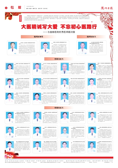 为隆重庆祝第四个“中国医师节”,大力弘扬“敬佑生命、救死扶伤、甘于奉献、大爱无疆”的精神,树立随州卫健系统的良好形象,彰显大医精诚、医者仁心的精神风貌,着力营造尊医重卫的社会氛围,为建设神韵随州、健康随州作出新贡献,市卫生健康委员会、随州日报社联合推出纪念特刊——《与“随州医师奖”“随州好医生”“随州名医”“优秀医师”“优秀科主任”面对面》,本报今日刊登的是与曾都医院优秀医师面对面,敬请读者关注。