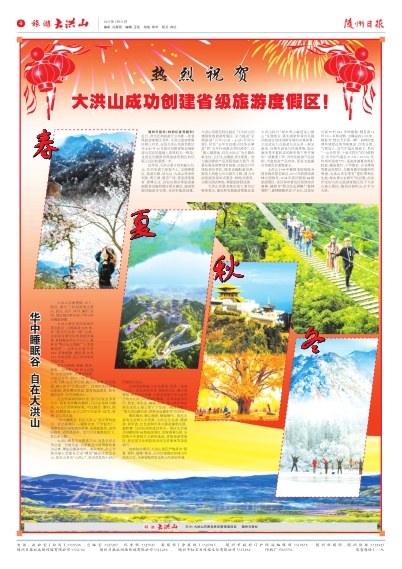 顺风顺水、顺心顺意、顺福顺气。依托丰富的生态和人文资源,大洪山生态游、健康游、研学游、红色游和四季主题游蓬勃发展,越野赛、马拉松连续成功举办。景区先后成功创建国家4A级旅游景区、国家森林公园、全国青少年爱国主义教育基地、省级旅游度假区,获全国文化和旅游系统先进集体等荣誉称号。