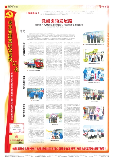 在中国共产党成立101周年之际,全市“两优一先”表彰大会隆重召开,我市50个基层党组织被授予“市直先进基层党组织”称号。为全面展示我市基层党组织党建丰硕成果,随州日报隆重推出全市先进基层党组织巡礼展示专题宣传,今日刊发的是市直先进基层党组织——随州市兴九星运业股份有限公司抓党建促发展纪实,敬请读者关注。