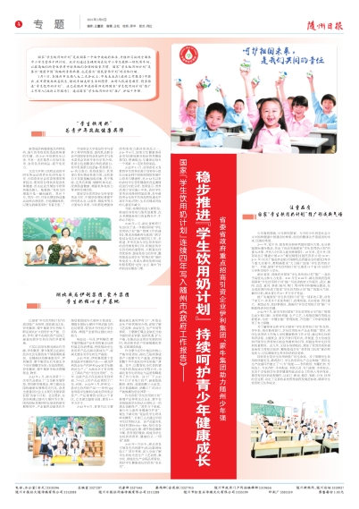 1月5日,在随州市五届人大二次会议上,市长克克在《政府工作报告》中提出,我市将致力改善民生,绘就幸福美好生活新图景,办好人民满意教育,稳步推进“学生饮用奶计划”。这已是随州市政府第四次将国家“学生饮用奶计划”推广工作写入《政府工作报告》。通过国家“学生饮用奶计划”推广,护佑少年强。