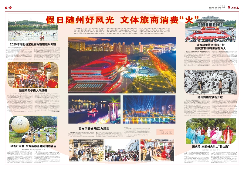 编者按:10月1日至2日,我市2025年国庆、中秋长假文体旅和商超消费开局良好。炎帝故里景区、草甸子历史文化街区、大洪山风景名胜区、西游记公园、银杏谷、三潭等景区的各项文旅活动如期展开,随州博物馆综合提升改造后焕新开馆,在白云湖举办的湖北省桨板锦标赛激情开赛,让游客流连忘返。与此同时,各商超、餐饮店搭乘“惠购湖北”消费券促销东风,顾客盈门;万达广场前举办的“好车驾到,畅享未来”金秋车展吸引市民前往赏车试驾,实现了“市民得实惠、商家得效益、市场得活力”的多方共赢。为展现“双节”期间随州繁荣景象和消费活力,本报特选编了部分记者和摄影爱好者现场拍摄、记录的图文,以飨读者。
