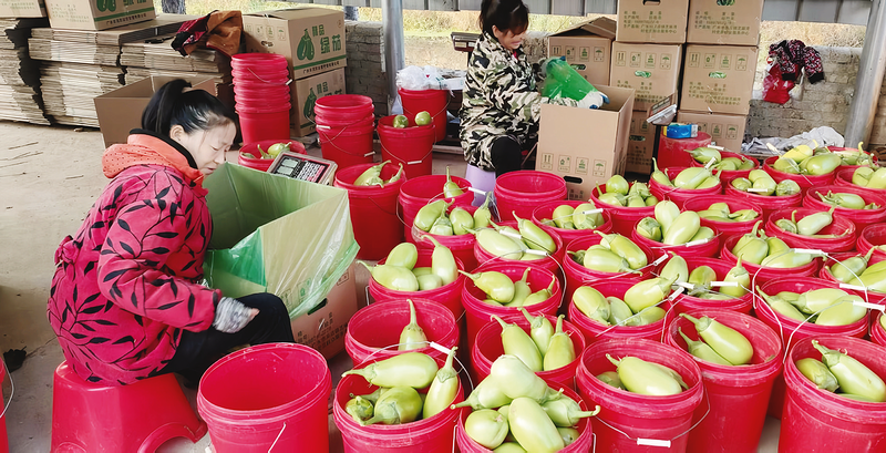金秋十月,广水市吴店镇芝麻湾村茄子迎来丰收,该村依托“订单+”模式,让鲜茄搭上销售快车,直达商超货架。图为村民打包茄子。