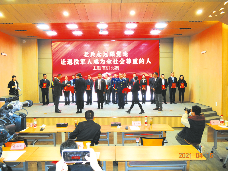 骕骦社区党支部书记、居委会主任刘建波(右二)代表随州市参加湖北省退役军人事务厅举办的演讲比赛