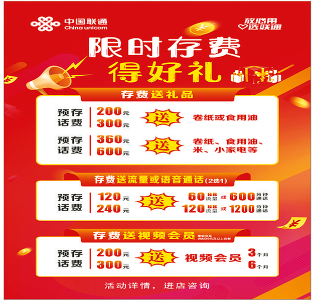 即日起参与话费预存活动,即可得任意好礼:家居必备的卷纸/食用油/小家电,或热门视频平台会员、流量、语音通话等,多重选择,诚意满满。