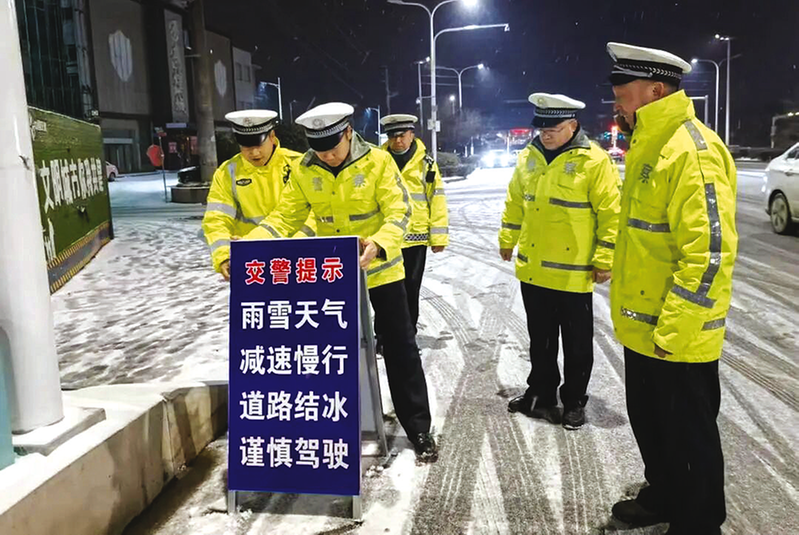 “同志,刹车的时候慢点,地上滑!”全市交管、派出所、机关下沉民辅警在城区各重点路口、路段部署警力开展执勤,及时应对各种突发交通情况,救援、拖移抛锚车辆,提醒过往行人注意路面安全,用实际行动守护一方平安,传递严寒中最温暖的警色。
