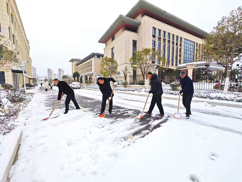 市不动产登记中心党员干部清除办公区及周边道路积雪。(随州日报通讯员刘姝彤摄)