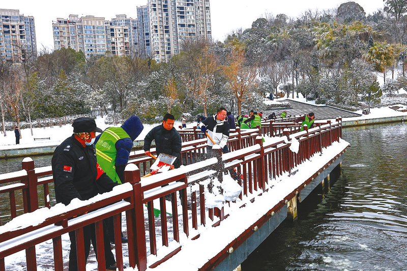 城管部门清除公园积雪。(随州日报通讯员聂少峰、高菁艳摄)