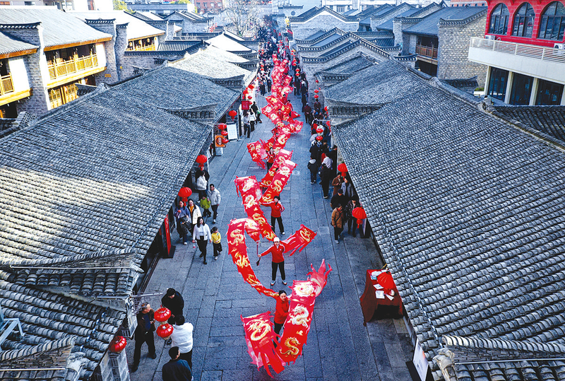 春节期间,炎帝文化旅游区舞狮活动吸引大量游客互动