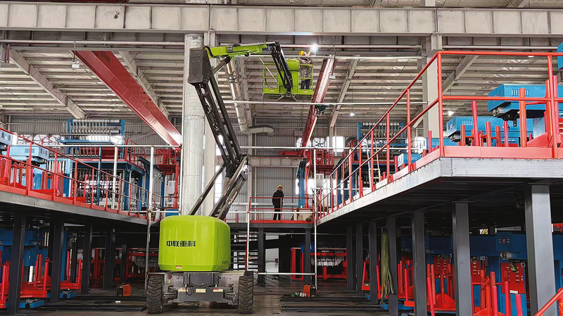 另一边,技术工人正熟练地操作着绿色的高空作业平台升至半空,抓紧对厂房骨架、线路和大型生产设备进行精细化的检修、维保与调试。企业铆足干劲,坚持生产运转与设备升级同步推进,有效保障了现有生产线的安全稳定运行,为企业后续全面释放产能、提升核心竞争力筑牢了坚实的基础。