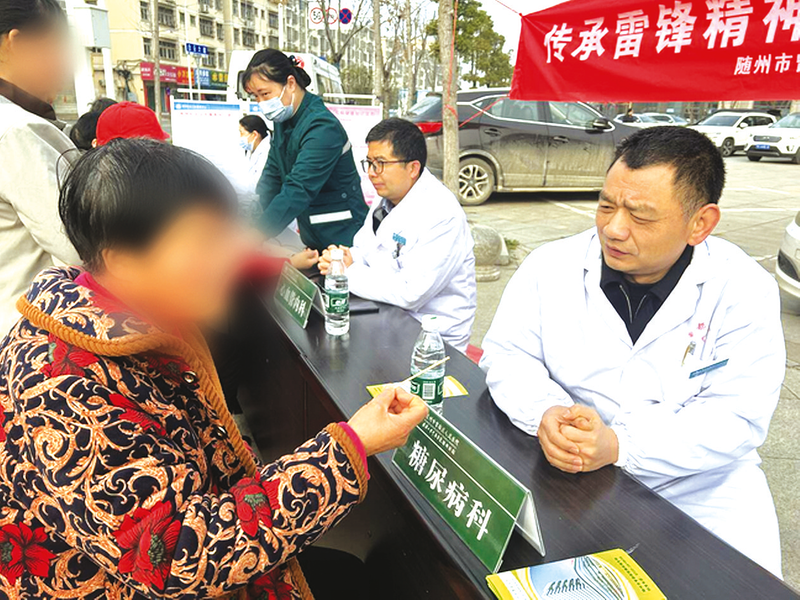 近日,随州市曾都区人民医院联合曾都区南郊街道社区卫生服务中心,走进白云社区开展“传承雷锋精神,关爱百姓健康”义诊活动,将优质医疗服务送到群众身边。 (通讯员 华晶晶摄)